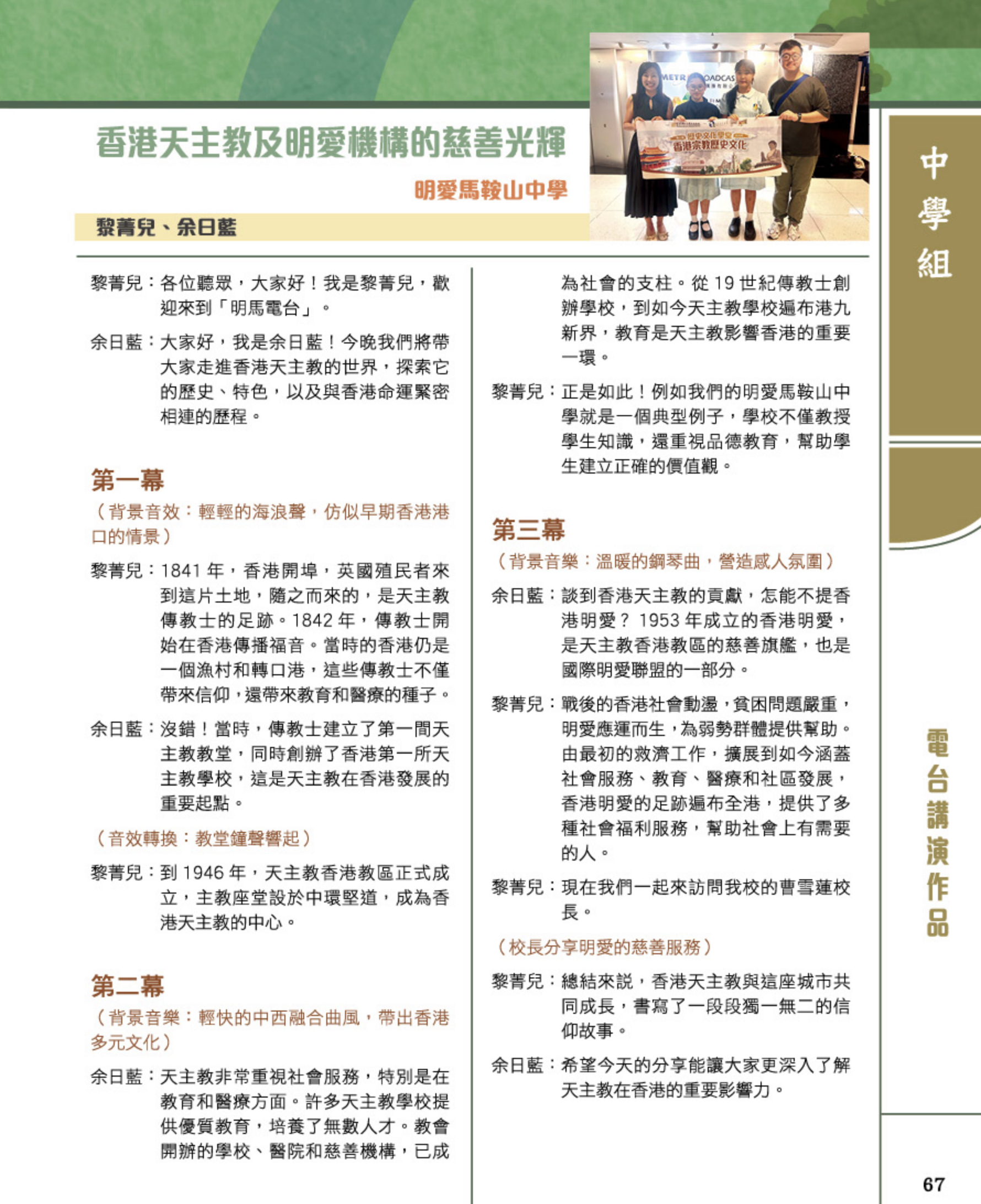 2025-12-11 本校余日藍、黎菁兒同學連續第二年在《歷史文化學堂》電台講演比賽入選,獲安排與曹雪蓮校長到新城電台錄製「香港天主教及明愛機構的慈善光輝」節目。主辦方近日出版《歷史文化學堂(第十屆)──香港宗教歷史文化 成品集》,收錄了三位的講稿。