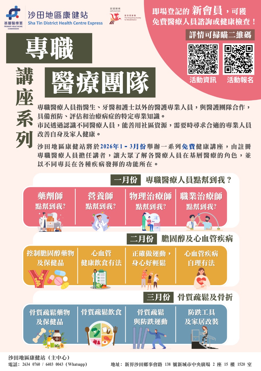 學校積極推動「醫護教育」,與沙田地區康健站於2026年1月24日(星期六)及2月21日(星期六)下午分別合辦與「物理治療」相關的講座,讓區內人士及學校持份者加深對物理治療的認識和了解,懂得如何從日常中正確做運動,以舒緩身心的疲累和壓力。歡迎師生及社區人士報名參與,以提升對健康的關注及認識。