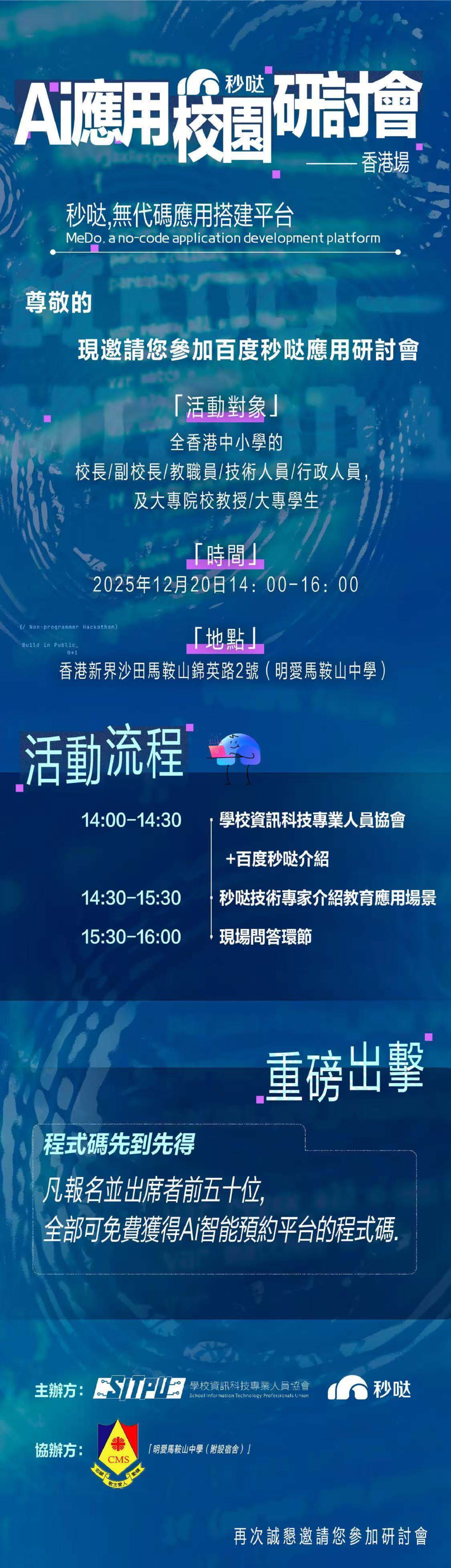 到時將由百度專家分享秒哒平台的最新案例及實用功能,讓參加者親自感受AI工具如何提升老師工作效率及為校園帶來便利。無論您是教師、技術人員還是對AI有興趣的朋友,都不容錯過這場研討會!