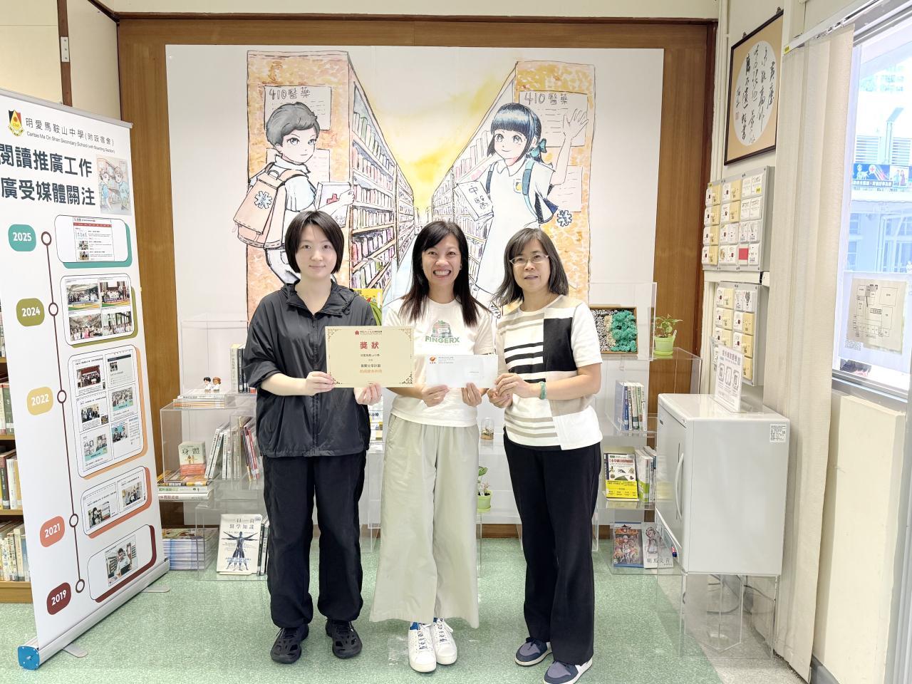 香港大公文匯傳媒集團頒發「喜悅分享:最積極參與學校」獎項予本校,嘉許本校學生在寫作閱讀報告的佳績,同時也頒發八個個人優秀獎項予李儷儷、蘇美君、梁心瑜同學,以及另外幾位本校舊生。該集團更於上星期在機場亞洲博覽會兒童書展設置攤位,展示同學們出色的閱讀報。本校恭喜各位小作家獲得高度肯定。再次印證明馬的閱讀風氣和學生才華,廣受外間不同機構的認同。