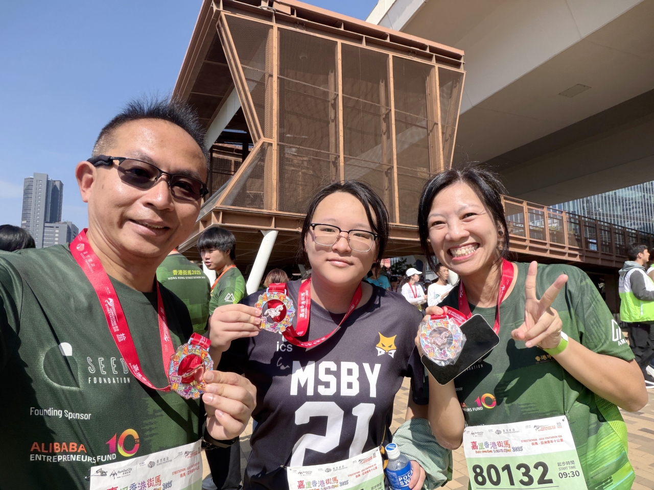 「嘉里香港街馬」不僅是一場體育競技,更是一堂生動的人生課。整個參賽過程中,學生們深刻體會並實踐了多項正面價值觀和態度,尤其是「堅毅」與「勤勞」。「勤勞」:為目標付出不懈努力 參賽的兩位學生深明「一分耕耘,一分收穫」的道理。從日常的恆常訓練到賽前的系統性準備,他們展現出極高的自律性與勤勞態度。他們犧牲了部分休息時間,在老師和家人的鼓勵下,風雨不改地進行練習。這種為目標持續付出努力的過程,比完成比賽本身更為重要;「堅毅」:跨越極限、永不放棄 十公里賽道對學生的體能和意志力都是嚴峻的考驗。在比賽過程中,難免會遇到體力透支或肌肉痠痛的時刻。然而,在師長的陪伴與鼓勵下,他們學會了忍耐與堅持,用強大的意志力克服了身體上的不適。每一步前進,都是對「堅毅」精神的最好詮釋。當衝過終點線的一刻,他們臉上洋溢的,不僅是完成比賽的喜悅,更是戰勝自我的驕傲。