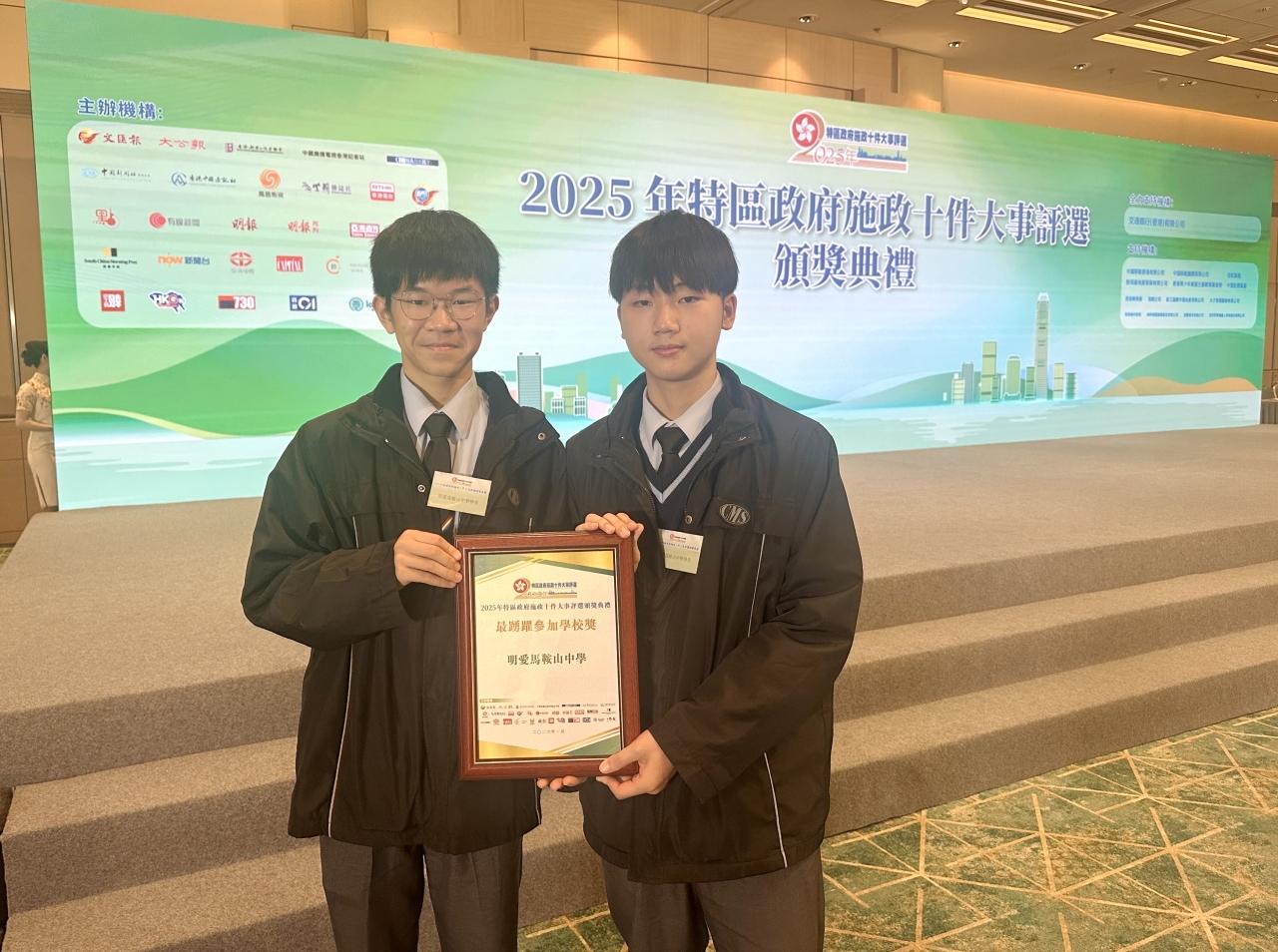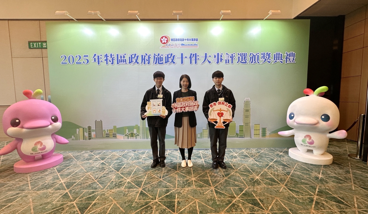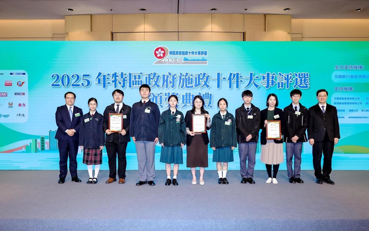 「特區政府施政十件大事評選」一直是市民回顧過去一年政府施政、關心社會發展的重要平台。本校學生是次踴躍參與投票,不僅反映了他們對特區政府施政的高度關注,更展現了新一代青年主動了解社會時事、積極履行公民責任的良好素養。李家超特首在頒獎時對獲獎學校表示嘉許,並寄語青年人要繼續多角度了解國情與港情,這對本校學生而言是極大的激勵。