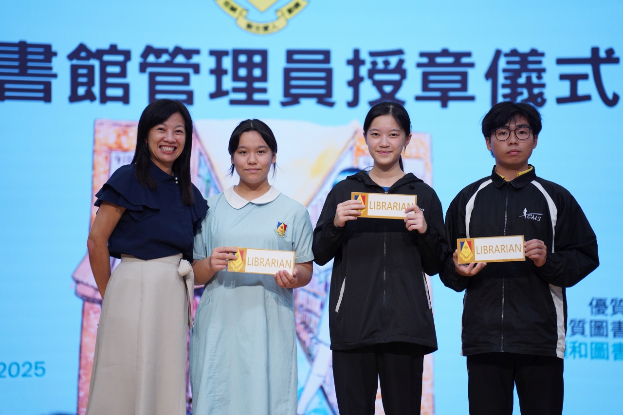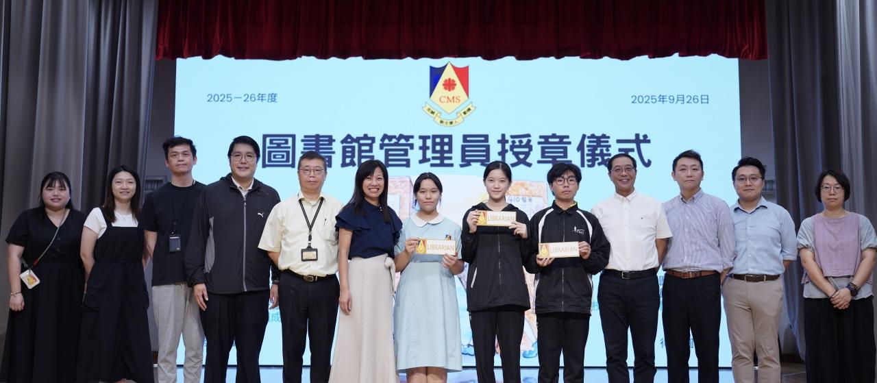 在9月26日,本校在早會舉行新一年的「圖書館管理員授章儀式」,由三位學生館長郭子揚、曹敏莉和陳彥彤代表全體三十多位學生管理員、組長和名譽館長領章,象徵圖書館正式開啟新一年服務,繼往開來。