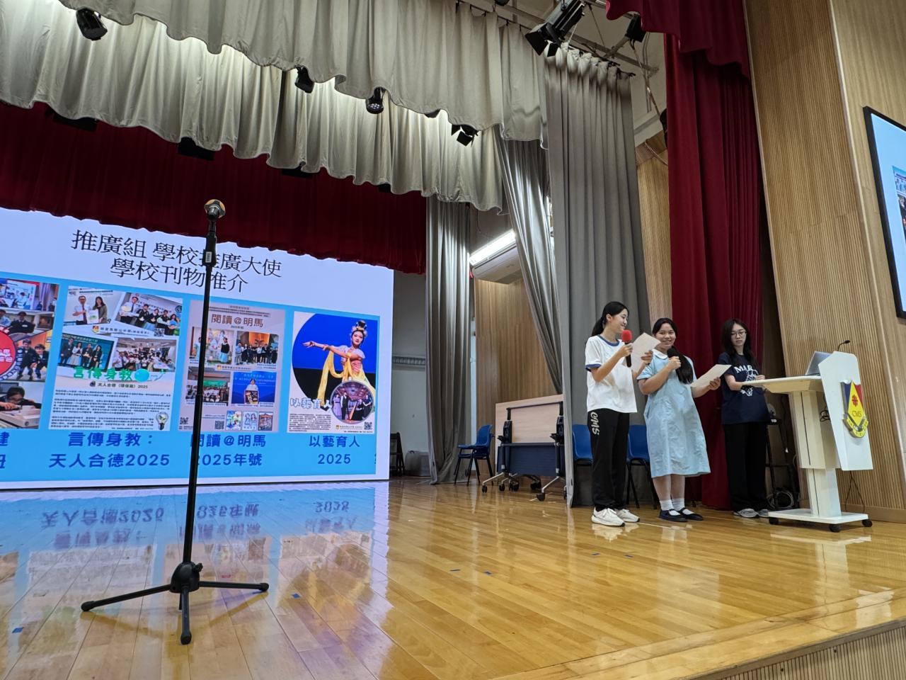 兩位學校推廣大使領袖3A陳彥彤和4A曹敏莉於10月3日早會,代表推廣組為學校四本新刊物《醫療保健教育樞紐》、《以藝育人2025》、《閱讀@明馬2025年號》和《言傳身教:天人合德(環保篇)2025》進行新書發佈,讓同學加倍認識學校的發展和成就。有興趣閱讀的公眾人士,歡迎點擊以下連結閱讀:https://caritasmaonshan-my.sharepoint.com/:f:/g/personal/leeti_cmos_edu_hk/EjPfom5HCSZKuKkvdl9yuwkBVL3_kxCWQffaHgAZmF0Zhg?e=rEBsqk