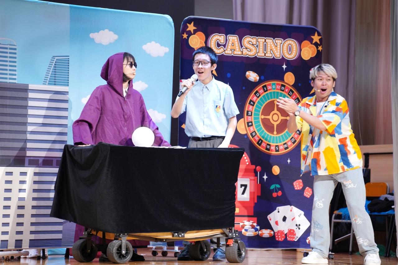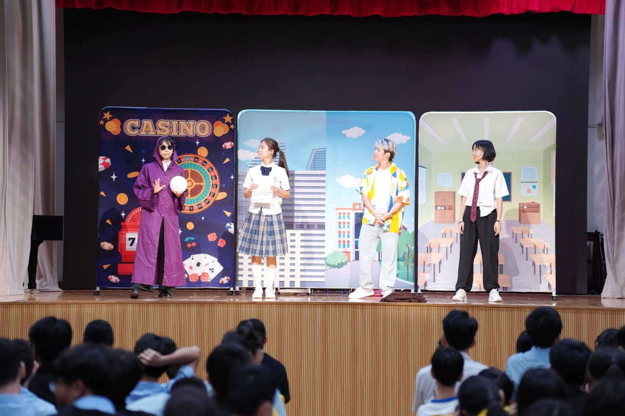 2025-09-17 學校德育組、國安教育小組及音樂科參與由平和基金資助,製作劇場主辦的「拒賭教育音樂劇:失驚無神又穿越」活動,讓學生懂得拒絕賭博,認識拒絕技巧,培養同學「自律守法」、「堅毅」、「誠信」等正確價值觀和態度,積極面對及拒絕各種誘惑。 校園展影 德育及公民教育