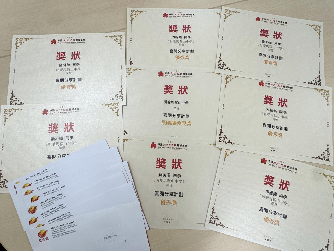香港大公文匯傳媒集團頒發「喜悅分享:最積極參與學校」獎項予本校,嘉許本校學生在寫作閱讀報告的佳績,同時也頒發八個個人優秀獎項予李儷儷、蘇美君、梁心瑜同學,以及另外幾位本校舊生。該集團更於上星期在機場亞洲博覽會兒童書展設置攤位,展示同學們出色的閱讀報。本校恭喜各位小作家獲得高度肯定。再次印證明馬的閱讀風氣和學生才華,廣受外間不同機構的認同。